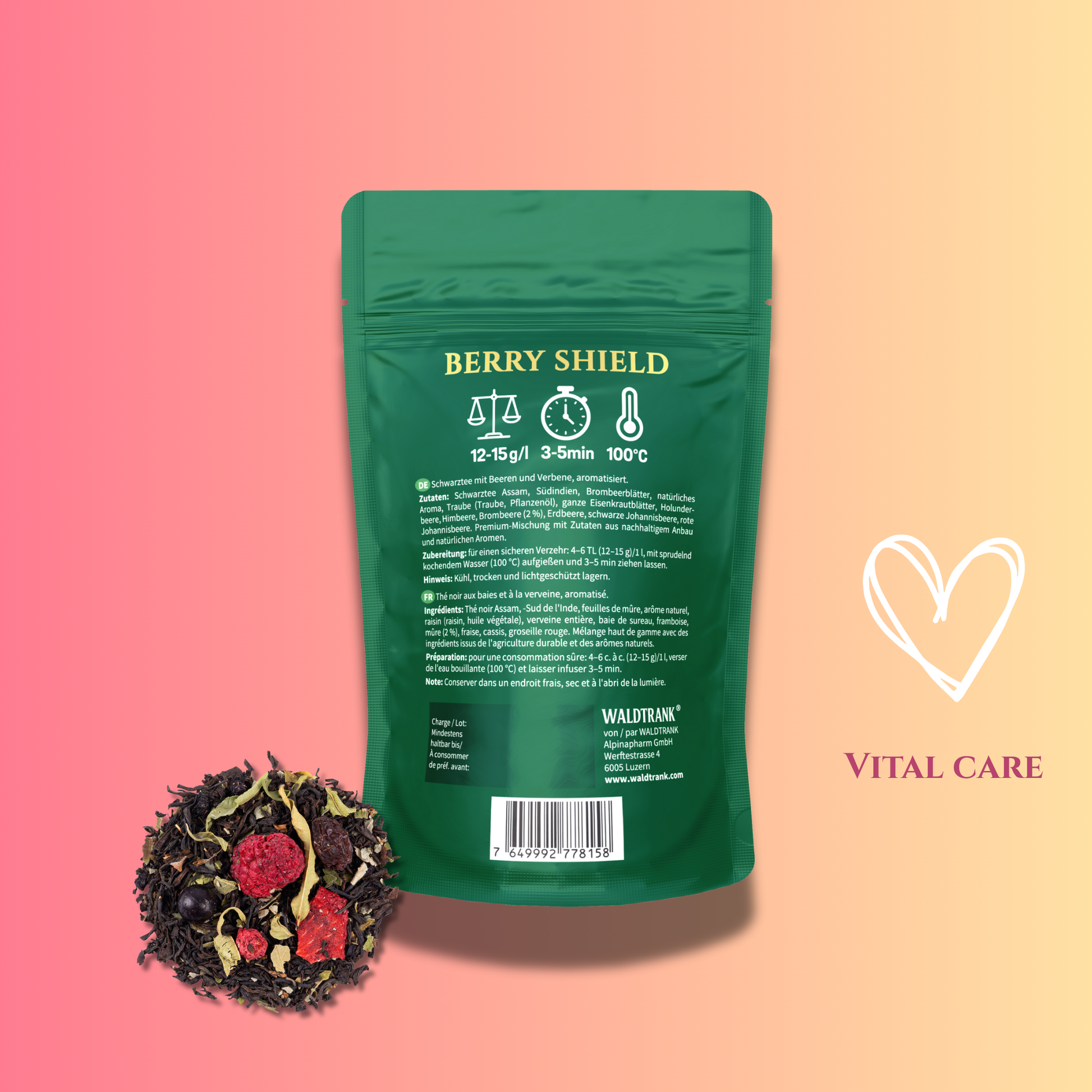 Assam tea provides caffeine and tannins that give structure, while berries offer anthocyanins and organic acids typical of antioxidant-rich fruits. Elderberry adds depth and verbena contributes a mild herbal roundness. The blend fits the Vital Care concept through its rich, restorative fruit and tea balance.
