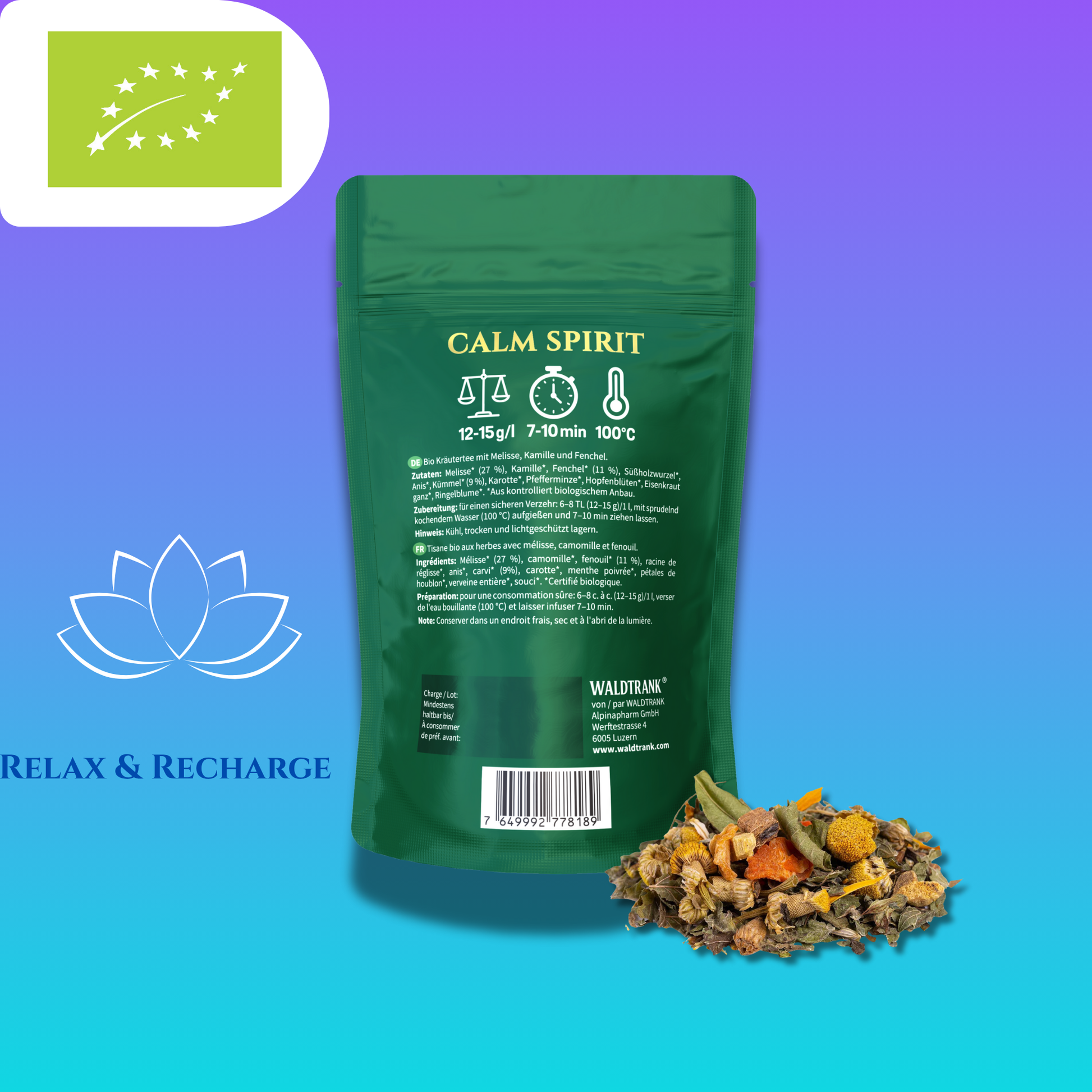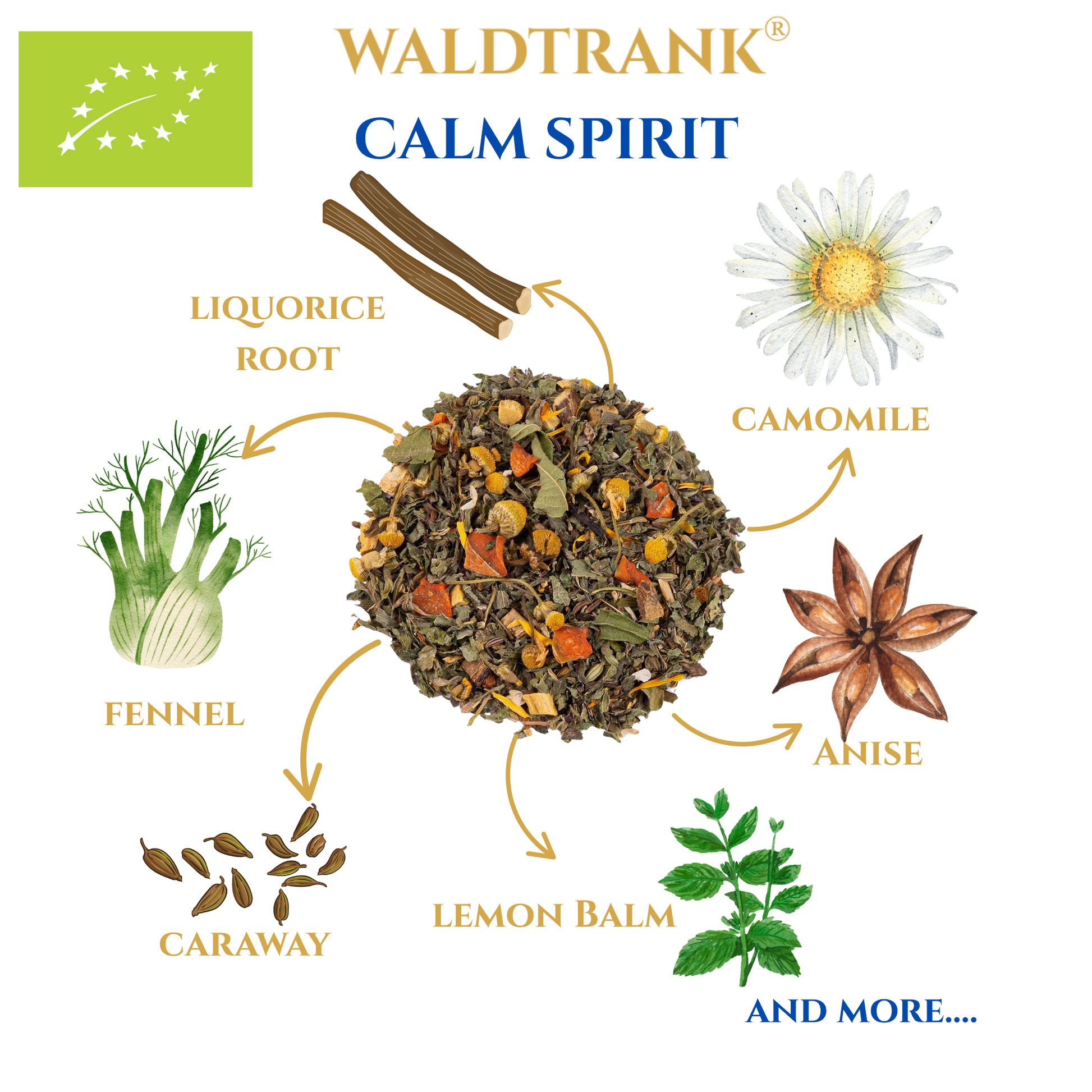 WALDTRANK® Calm Spirit offers a mild, comforting cup with chamomile, balm and fennel at its core. Liquorice and anise add sweetness while peppermint refreshes the finish. It’s a gentle herbal companion for quiet evenings.