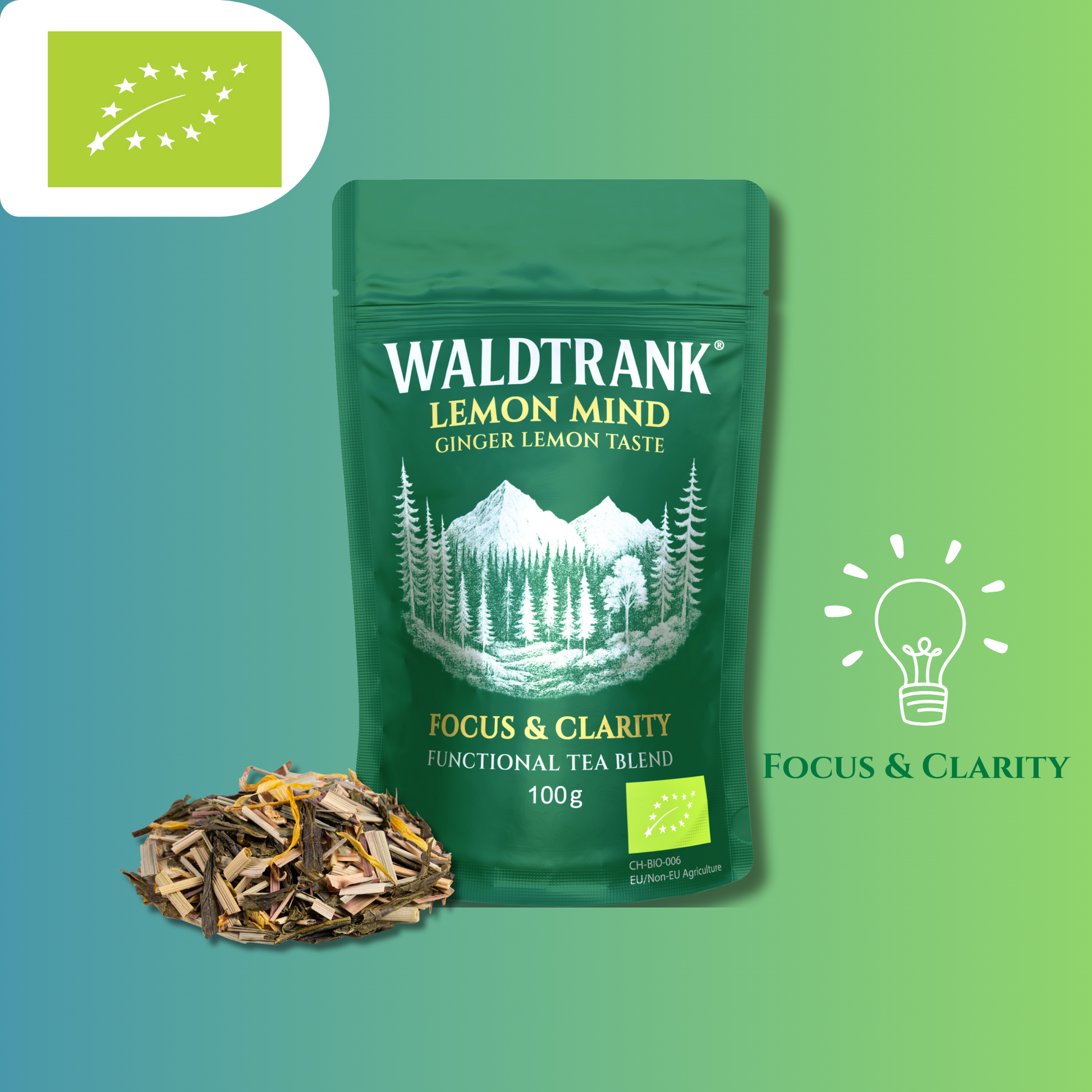 WALDTRANK® LemonMind offers a bright and refreshing experience with the combination of green tea, lemongrass and ginger. Lemon peel and marigold bring a soft sunny finish. A tea created for clear, quiet moments that invite focus.