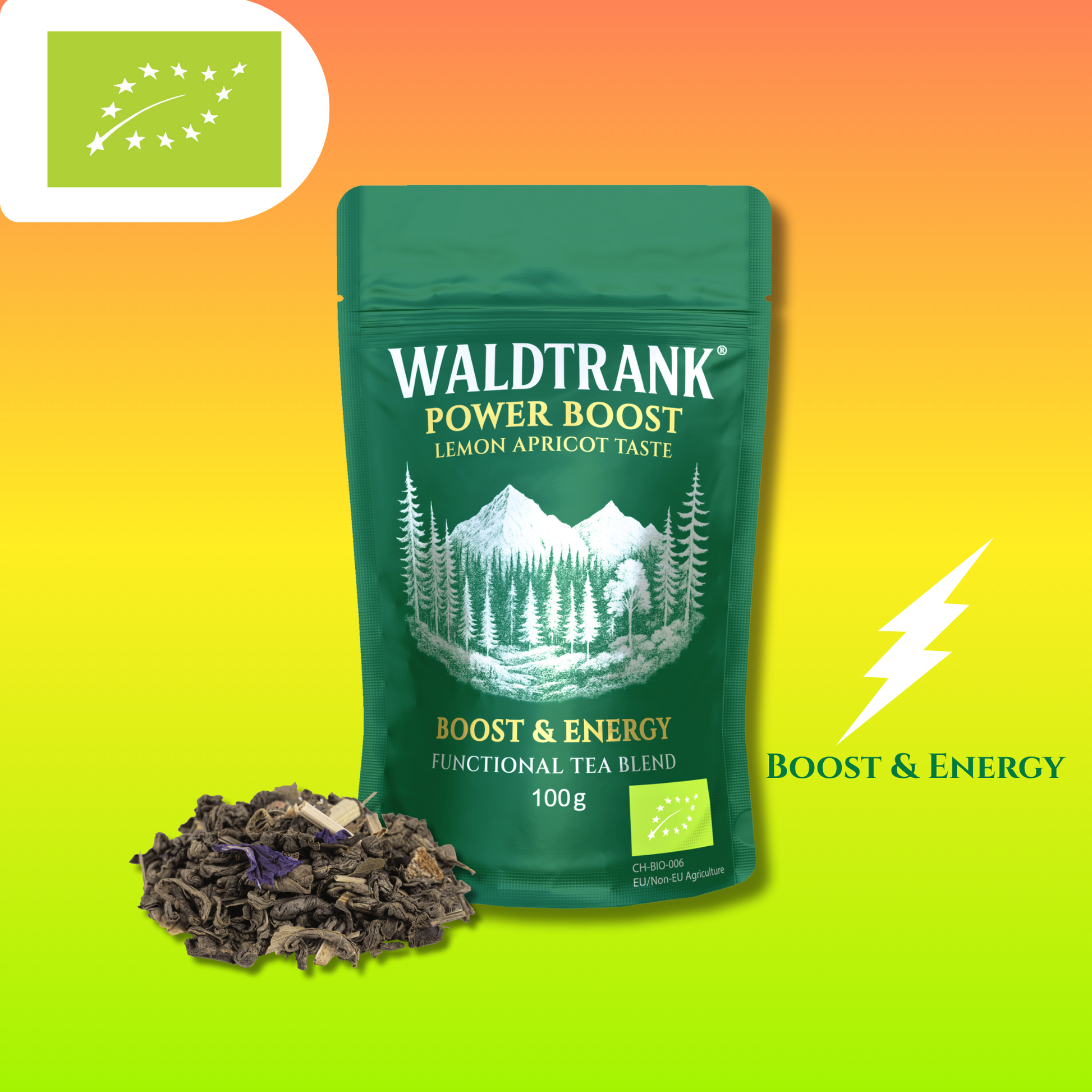 WALDTRANK® Power Boost helps you embrace your day with natural drive. Green tea, mate, matcha and guarana form a bright organic blend with soft citrus tones of lemongrass and lemon peel. You can taste the balance between freshness and energy in every cup.