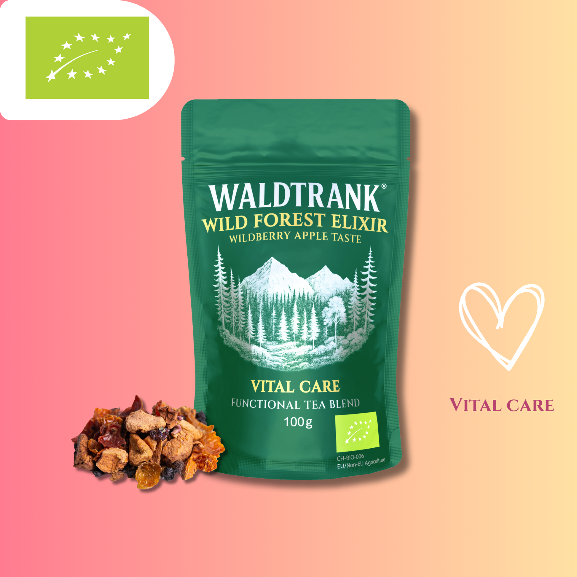 WALDTRANK® Wild Forest Elixir brings together elderberry, rose hip and wild blueberry in a caffeine-free organic blend. Apple and mallow soften the flavor, giving the cup a deep forest-fruit sweetness. A soothing infusion that feels rich and naturally grounding.