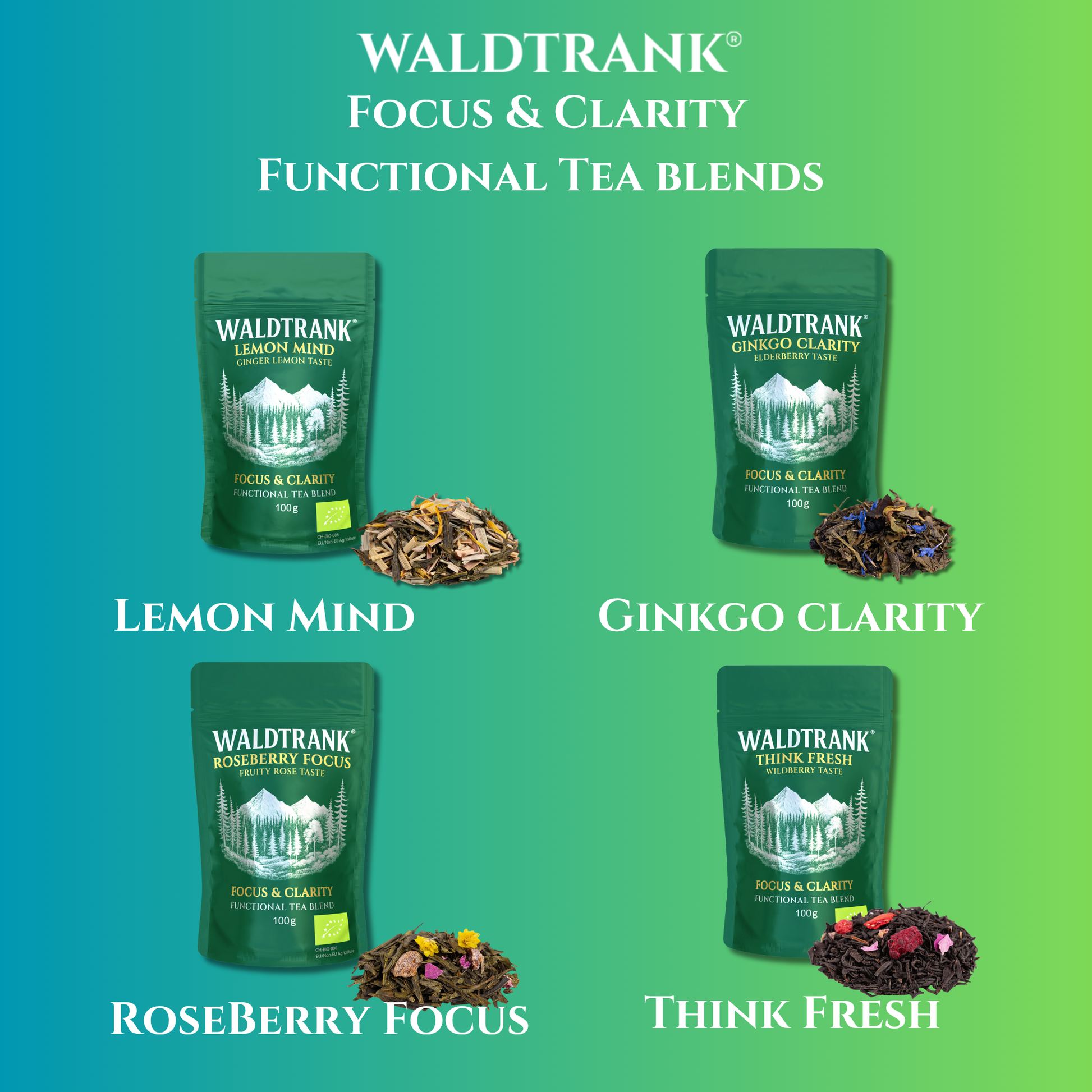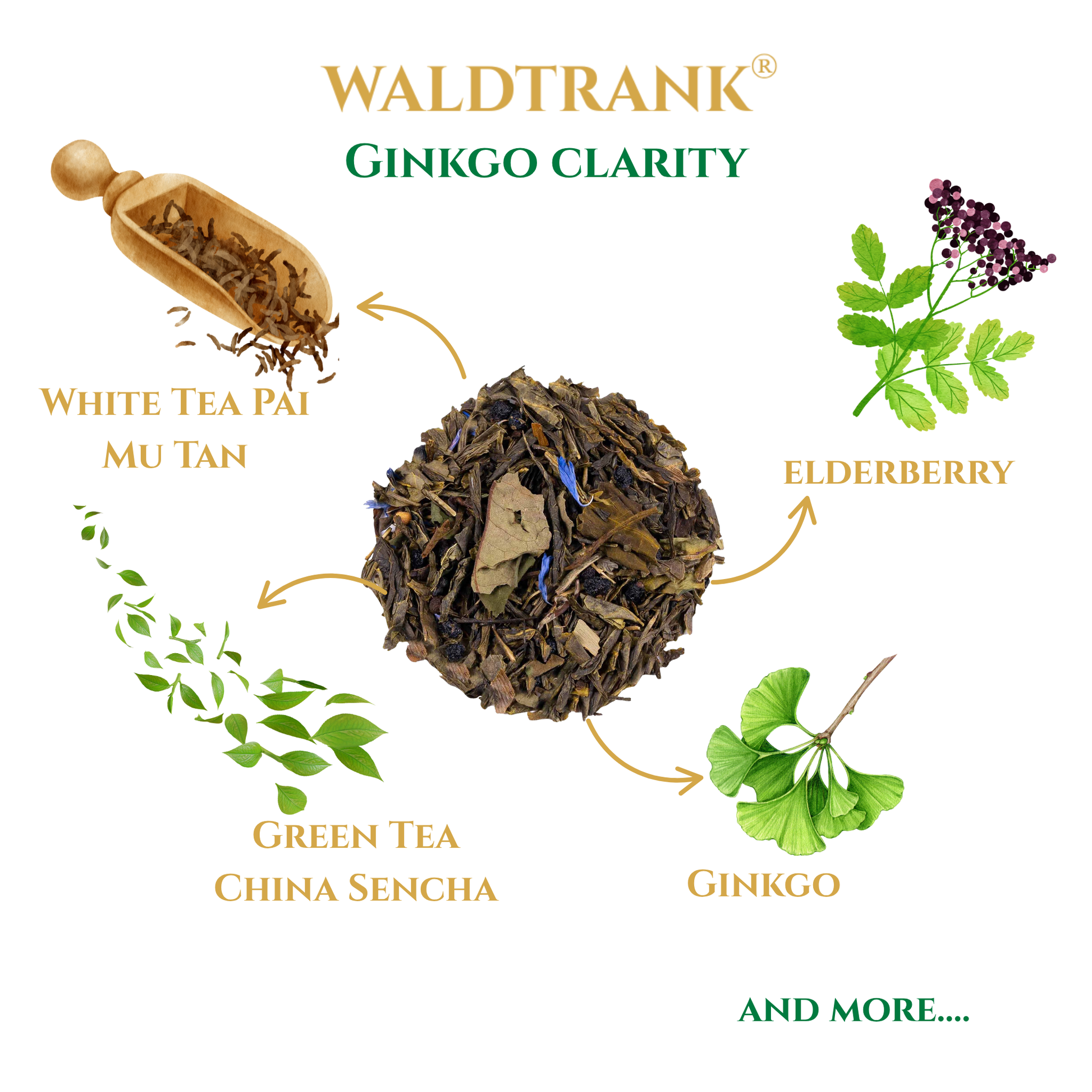 WALDTRANK® Ginkgo Clarity invites you to enjoy a cup that feels calm and composed. Green and white teas blend smoothly with elderberry, and a hint of ginkgo gives an earthy herbal note. It’s a delicate and thoughtful infusion for quiet concentration.