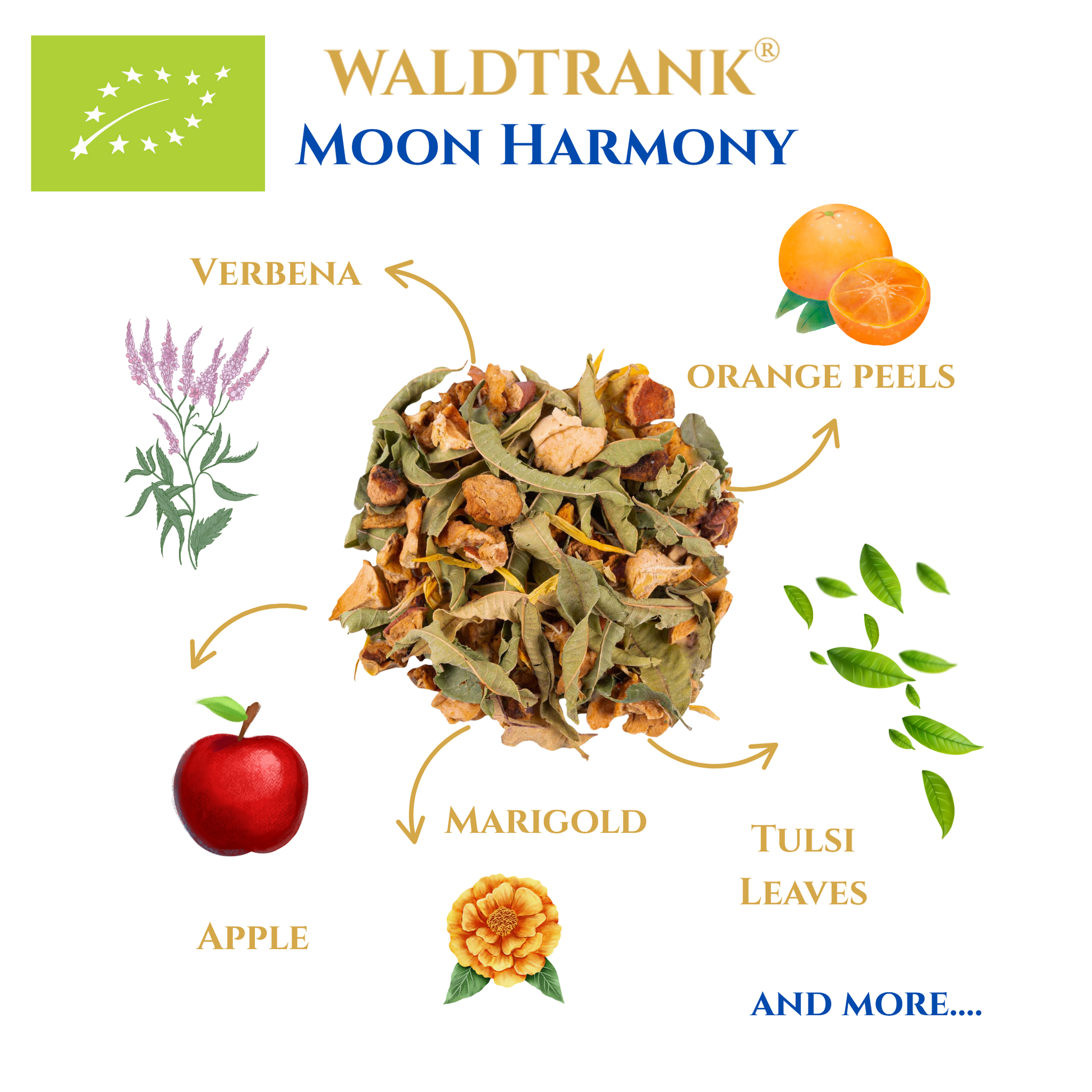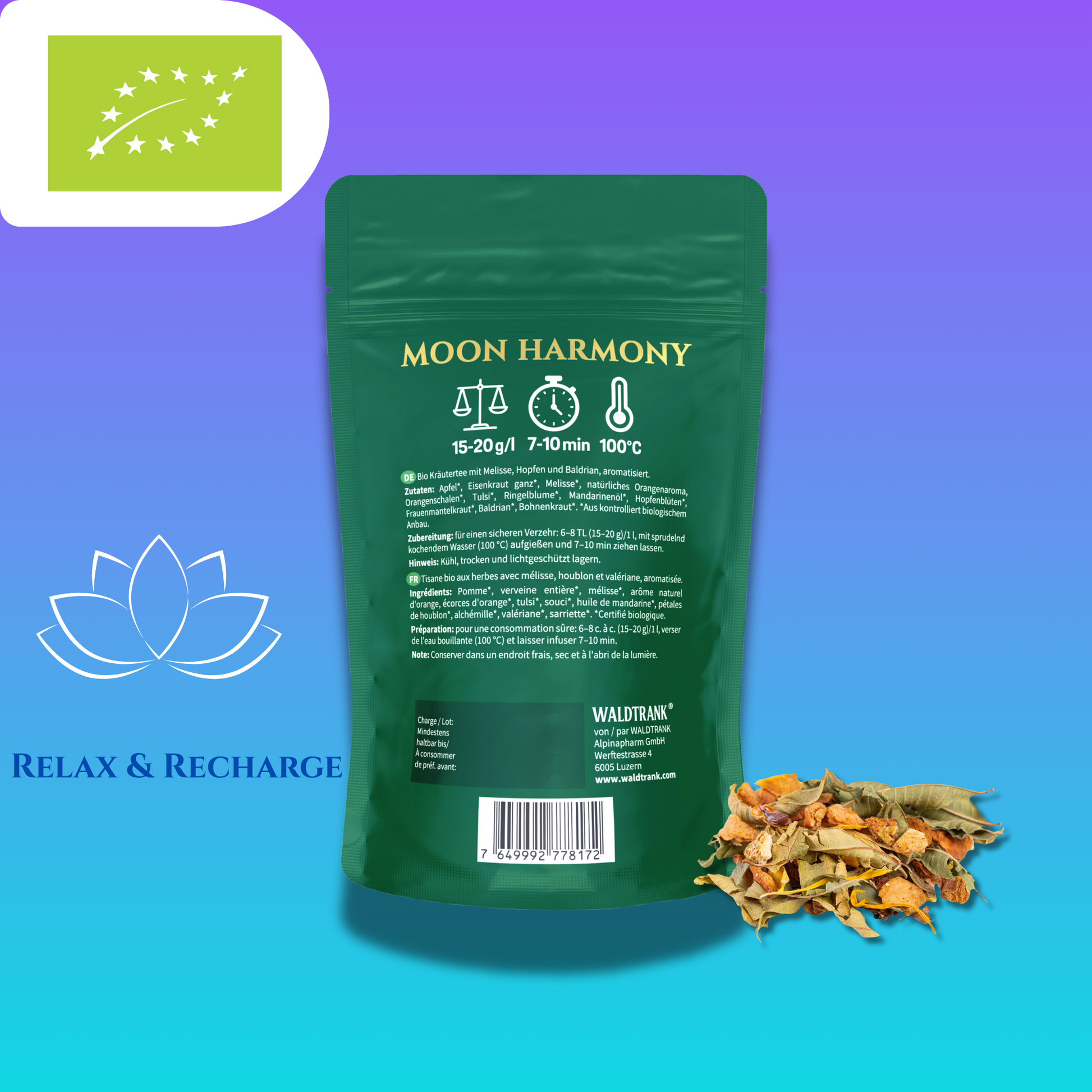 WALDTRANK® Moon Harmony combines balm, verbena and tulsi with soft hints of orange peel and mandarin oil. Valerian and hop petals bring a gentle herbal warmth that feels soothing and complete. A perfect evening tea to unwind.