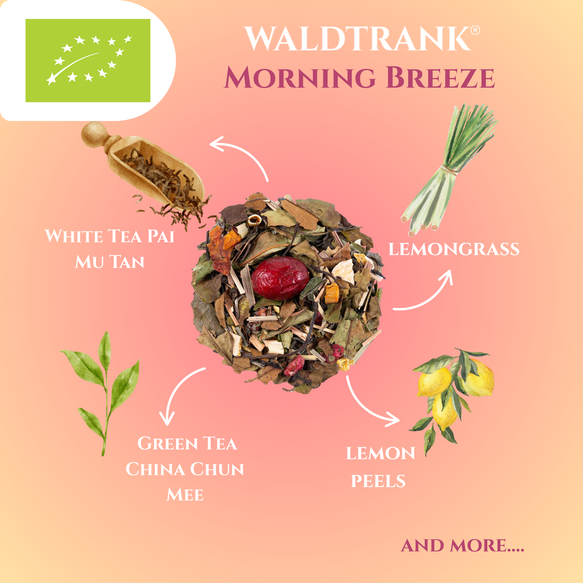WALDTRANK® Morning Breeze combines white and green teas with citrus, cranberry and pomegranate for a bright and elegant flavor. Liquorice root adds smooth sweetness and papaya a tropical touch. A tea that feels radiant and refreshing.