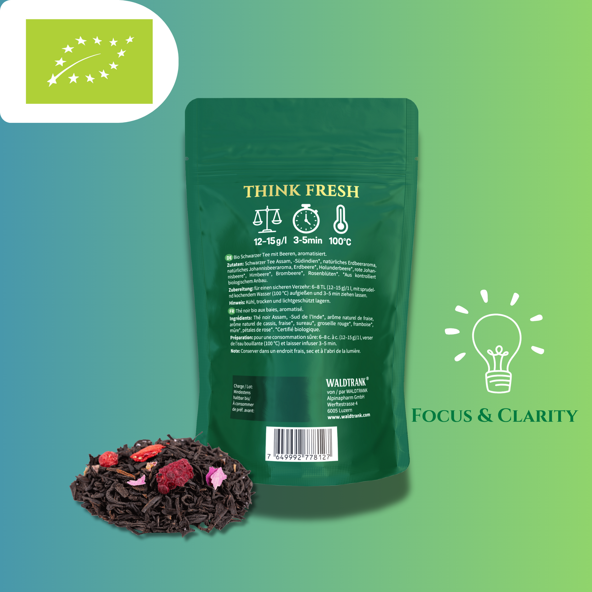 WALDTRANK® Think Fresh blends Assam and South Indian black teas with strawberries, raspberries and currants for a smooth, rich fruit infusion. Hints of elderberry and rose add gentle floral depth, creating a balanced, thoughtful flavor.