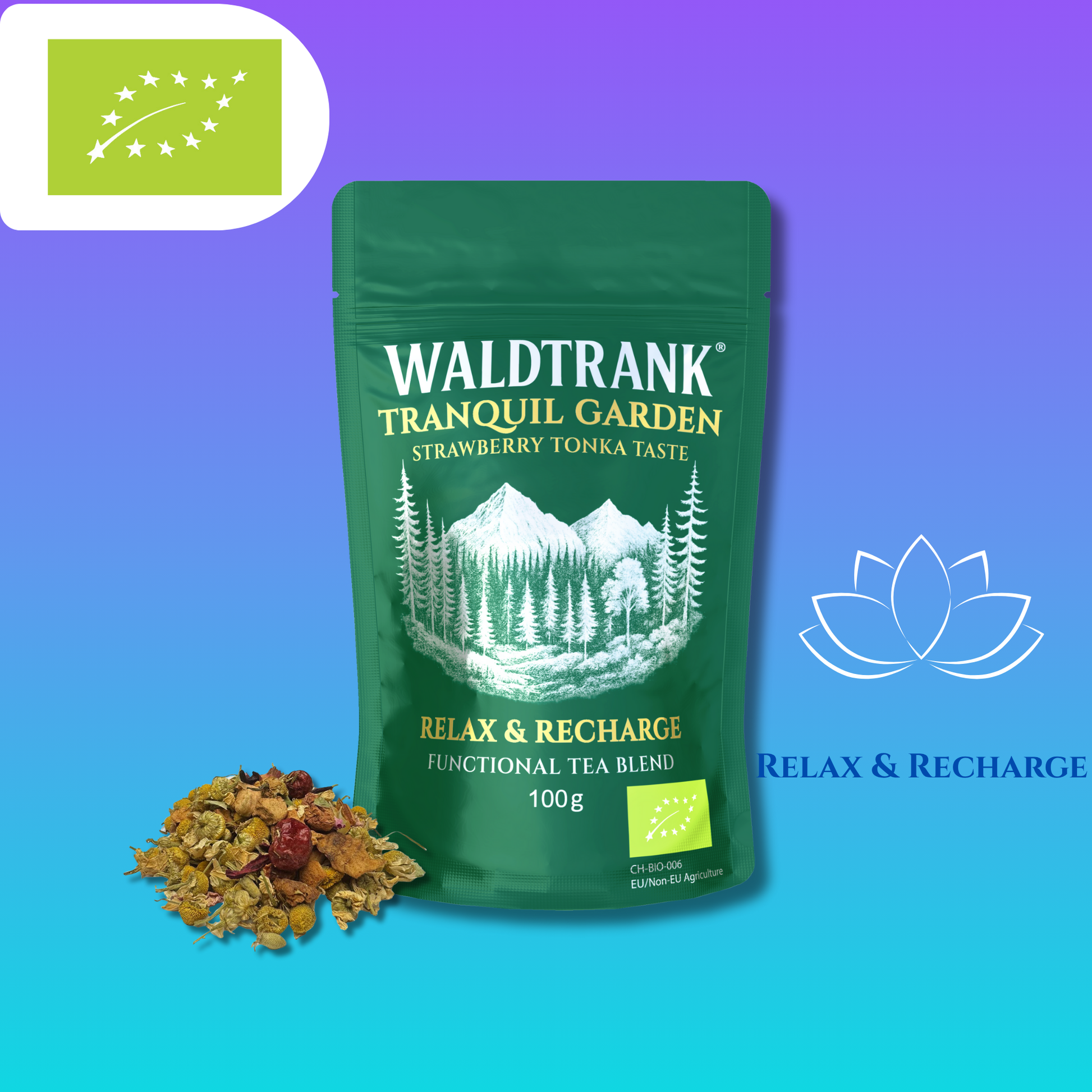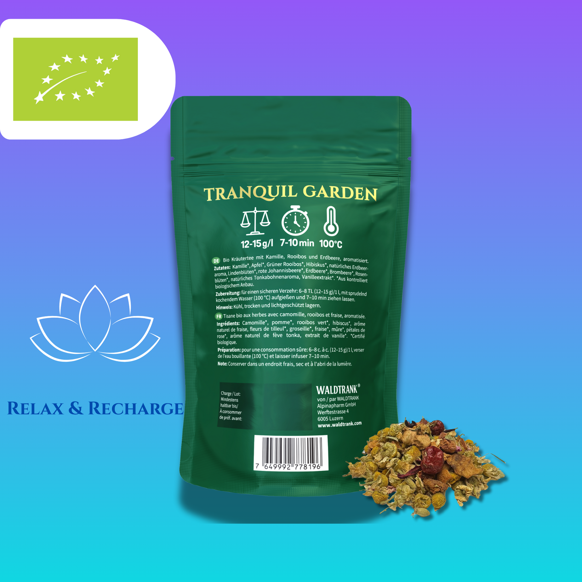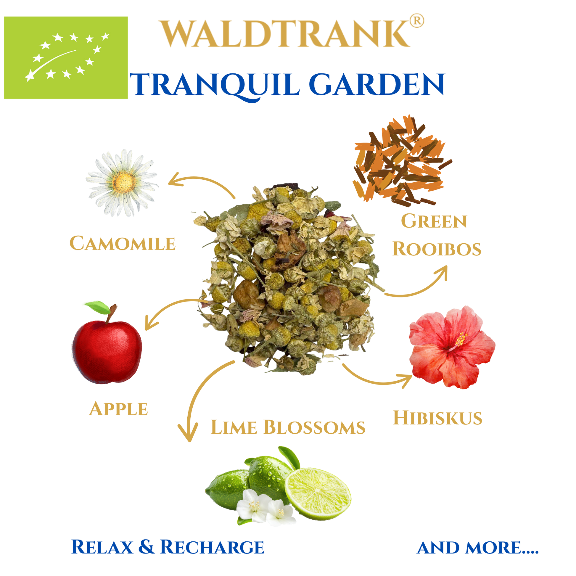 WALDTRANK® Tranquil Garden brings together chamomile, apple and rooibos with strawberry and lime blossom. Vanilla and tonka bean give a soft creamy finish. You can enjoy a gentle cup that feels like a quiet pause in a blooming garden.