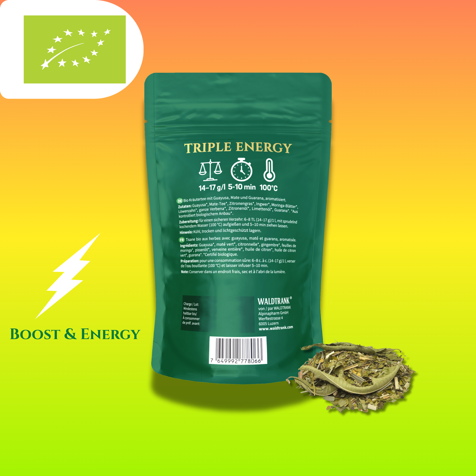 WALDTRANK® Triple Energy combines guayusa, mate and guarana to deliver a naturally bright and lively tea. Lemongrass and verbena provide herbal freshness that keeps the flavor crisp. A clean and dynamic cup for moments when you want to feel naturally awake.