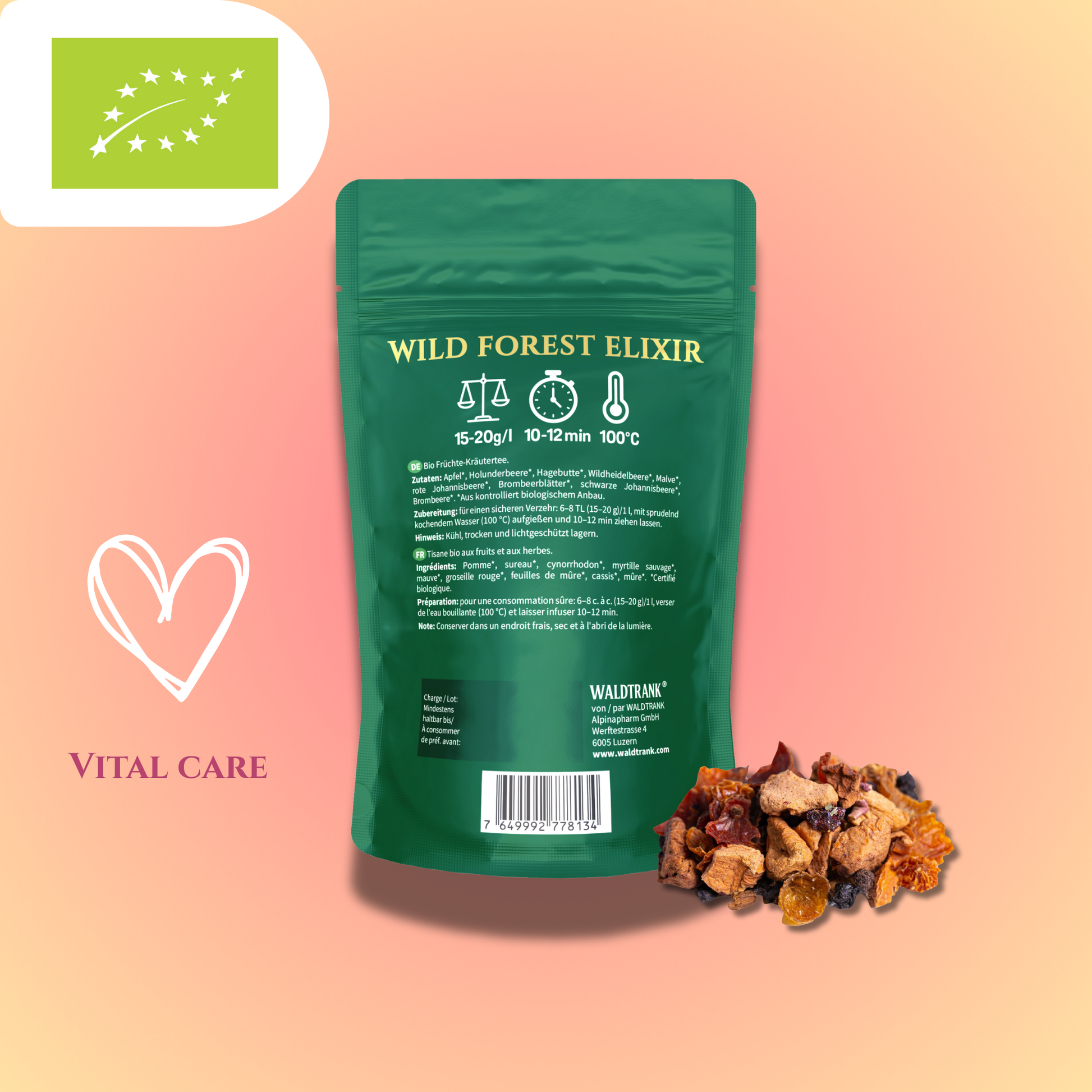 WALDTRANK® Wild Forest Elixir brings together elderberry, rose hip and wild blueberry in a caffeine-free organic blend. Apple and mallow soften the flavor, giving the cup a deep forest-fruit sweetness. A soothing infusion that feels rich and naturally grounding.