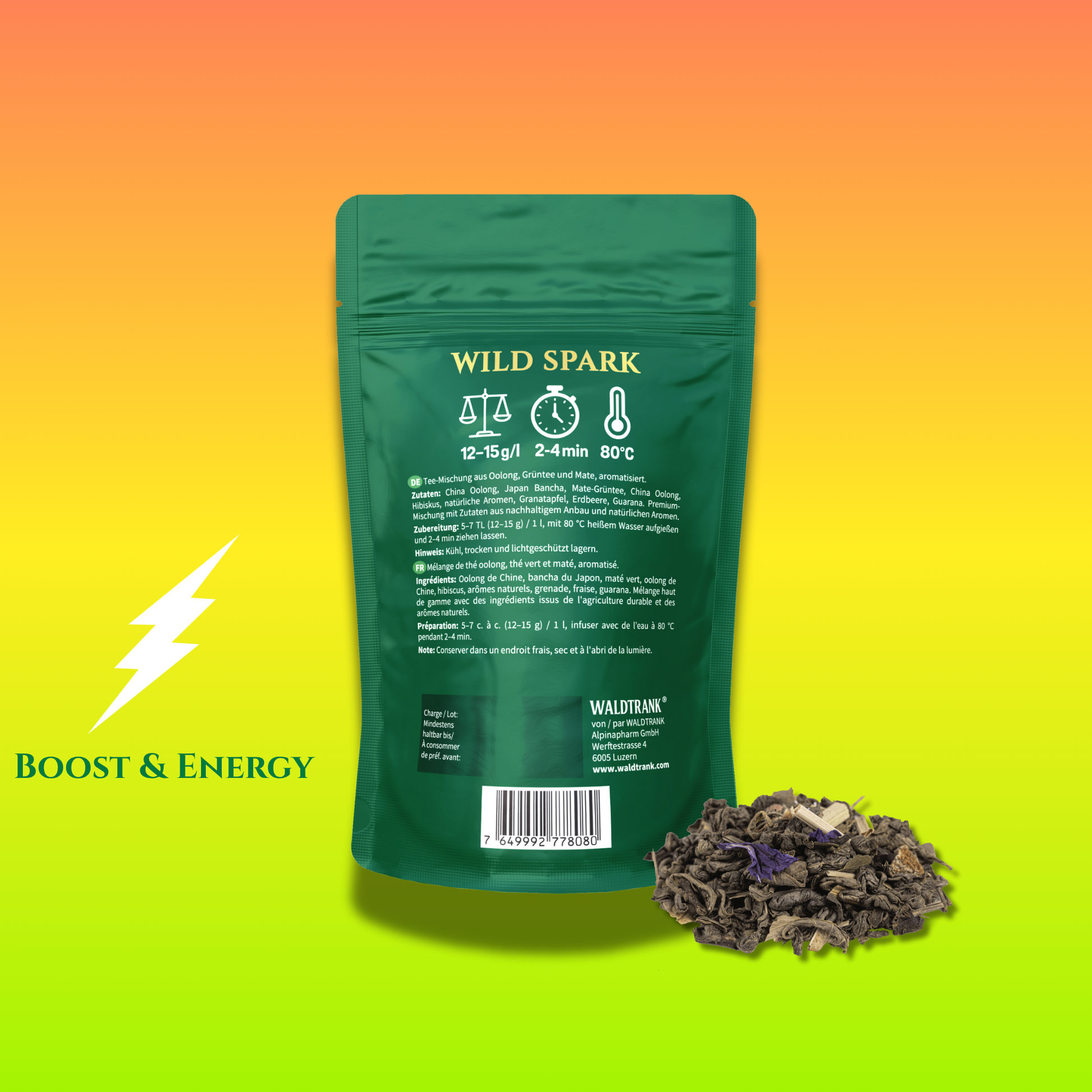 WALDTRANK® Wild Spark is a fruity organic tea crafted for active moments. Oolong, Bancha, mate and guarana form the foundation while hibiscus, pomegranate and strawberry add vibrant red-fruit tones. You can feel the lively rhythm of its flavor from the first sip.